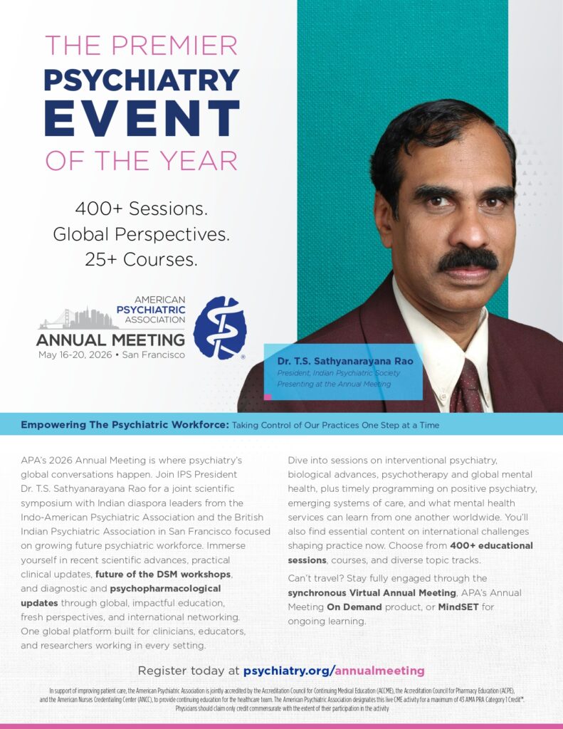 APA’s 2026 Annual Meeting is where psychiatry’s global conversations happen. Join IPS President Dr. T.S. Sathyanarayana Rao for a joint scientific symposium with Indian diaspora leaders from the Indo-American Psychiatric Association and the British Indian Psychiatric Association in San Francisco focused on growing future psychiatric workforce.